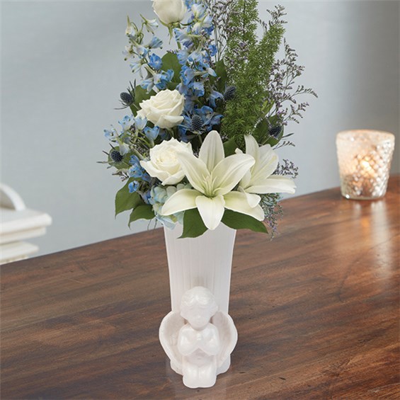 Delphinium, Asiatic lily, roses, hydrangea, eryngium and limonium are artistically arranged in an elegant vase adorned with a praying cherub. A beautifully designed tribute that will be long remembered.